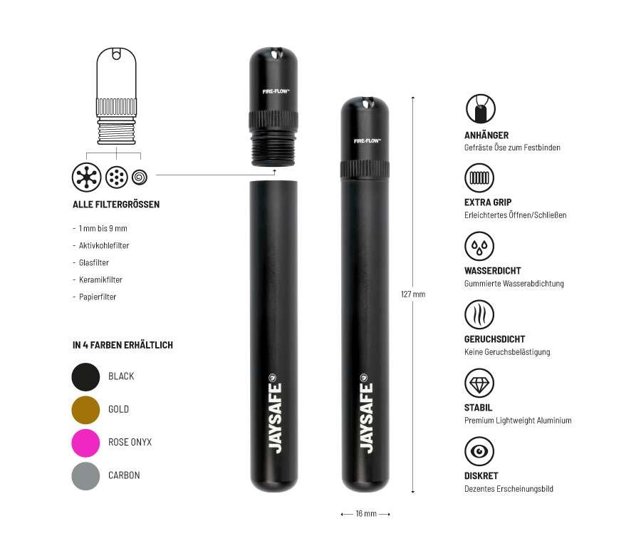 Welkom in een nieuw tijdperk van gezamenlijk roken met de JAYSAFE® Joint Holder Case van FIRE-FLOW.™ Als ’s werelds eerste joint case met een innovatieve dekselhouder, herdefinieert de JAYSAFE® je rookervaring. Plaats veilig en stevig alle gangbare filtermaten met een diameter van 1 mm tot 9 mm in het JAYSAFE-deksel®. Geen compromissen meer – geniet met een gerust hart van uw joint.